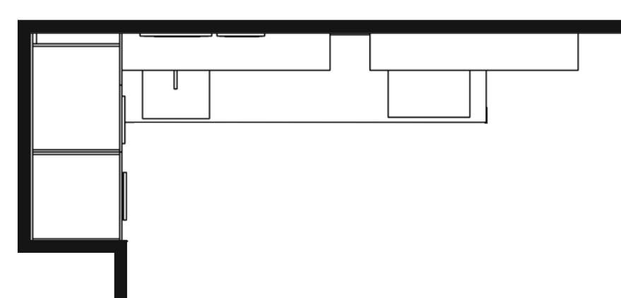 Давайте подробно разберем всю конструкцию, чтобы представлять о чем мы говорим. Перед нами вид сверху на мой кухонный гарнитур. Слева у нас ниша с пеналами, перпендикулярно к ним расположена основная часть кухни. Ниша была небольшой 1400 мм, поэтому решено было разместить только встроенный холодильник и хранение.