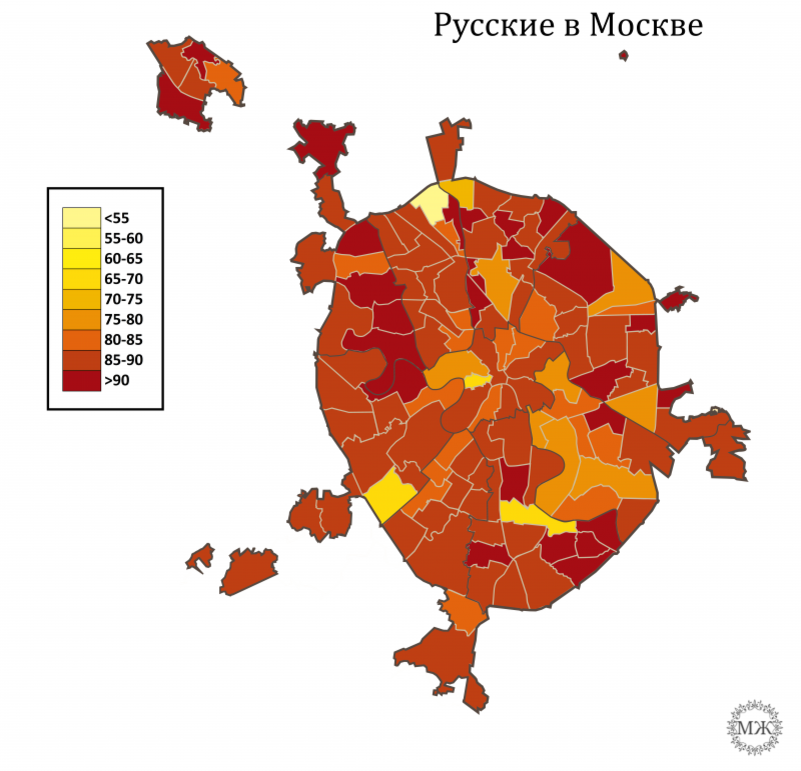 Данный пост вышел раннее на других платформах до существования аккаунта на Дзене. Информация, написанная здесь актуальна на момент выхода поста в Телеграме, ссылка на который есть в конце статьи. Оригиналы изображений с полным размером и без вотермарок доступны на Бусти за две недели до выхода новой работы. Москва довольно давно является многонациональным городом. И если в имперское время основным населением помимо русских были только евреи, то в советское время те малочисленные диаспоры украинцев и татар стали расти. Вместе с молодой диаспорой армян и ещё более молодой диаспорой азербайджанцев, они уже давно перегнали евреев. Как это выглядит, начнём с русских: Прослеживаются четыре малонаселённых русскими района, на первый взгляд. Но я веду подсчёт с учётом всех, в том числе и не указавших национальность. Именно поэтому они такие светлые, за исключением Арбата, с которым всё будет понятно далее. Почему в тех районах так много не указавших национальность — неизвестно. Вторыми с больши