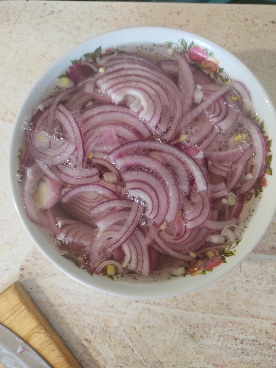 Рецепт салата от маминой подруги Оксаны :) Продукты: - лук красный/репчатый 2 шт.; - куриная грудка; - ананас 400 гр.; - сыр 200 гр.; - грецкие орехи 100-150 гр.; - майонез. Очистить, помыть и нарезать полукольцами пару средних луковиц. Можно использовать красный лук или репчатый по вкусу (у нас в рецепте красный лук). Ошпарить кипятком, чтобы ушла горечь. Отварить куриную грудку в подсоленной воде и нарезать на крупные кусочки. Добавить кусочки консервированного ананаса 400 гр. Натереть на крупной терке 200 гр. сыра. 100-150 гр. грецких орехов измельчить. Заправить все это майонезом по вкусу и перемешать. Салат готов! Приятного аппетита!