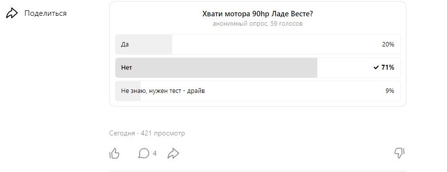 Приветствую всех читателей, которые посетили мою скромную страницу и уделили ей свое внимание. Установка мотора 90 "лошадей" и в целом продолжение производства Лада Веста - это самый яркий инфо повод прошедшей недели. Обсуждения этой темы не угасают и по сей день. В опросе который я опубликовал вчера мнения касаемо того, хватит Весте мотора 90 сил распределились следующим образом. Подавляющее большинство. а именно 71% из 59 человек ответили что такого мотора Ладе не хватит. 20% считают что и 90 сильного мотора Весте будет достаточно и лишь 9% необходим тест-драйв дабы понять всю суть. Моё мнение абсолютно схоже с 71% людей проголосовавших за ответ - нет. Ну а вот, что говорят люди относительно таких перемен в комментариях. -Если дилеры будут опять накидывать к цене свои 200-250тр.и продавать их только в кредит со всеми страховками и помощами пусть даже и не начинают...чего комплектующие зря переводить... В 2023 году, глядя на этот двигатель, хочется плакать. Неужели настолько вс