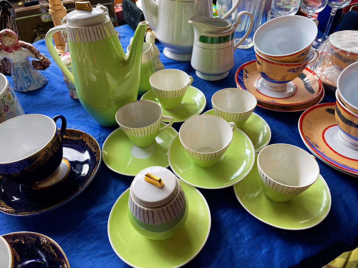 Добрый день дорогие друзья! В прошлые выходные посетила антикварные ряды Измайловского вернисажа и насмотрелась вдоволь на советскую посуду. Есть у меня такая слабость, люблю разглядывать вещи давно ушедшей эпохи, особенно с ценой, которая еще в рублях и копейках. Проходя среди рядов сделала себе фото нескольких вещей, которые меня заинтересовали. Например, вот этот нежный салатово-белый кофейный сервиз производства ГДР. Крышечки чайника и сахарницы покрыты позолотой и от этого набор смотрится празднично. Фарфоровый набор состоит из 12 предметов на 6 персон. Вместимость чашек 80 мл. В этом чудесном наборе есть чайник и молочник и сахарница с крышечкой. Сервиз изготовлен с 1970–1979 гг. Сзади на посуде есть и заводское клеймо.