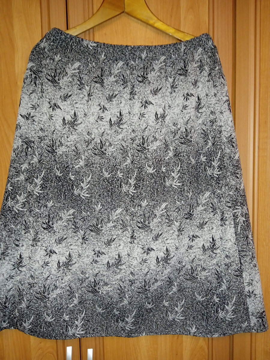 Платье новое, лежало в шкафу моей мамы, так как немного узковато. Юбка у платья немного расширена к низу, платье неотрезное по талии. Это позволило сделать полноценную юбку, расширив её за счет рукавов. Сначала отмеряем длину юбки от низа платья. В готовом виде юбка должна быть около 70 см. Юбка будет на резинке, поэтому добавила еще 6 см. на подгибку. Если юбка получится на пару см. длинее, это не страшно. Отрезала верх платья до бортов. Так как вставки в юбку будут достаточно большие, швы не распарываю. Часть шва, где был вшит бортик просто срезала. Затем продолжила линию отреза верхней части. Швы втачивани бортов застрочила и обметала. Эти рельефные швы будут на заднем полотнище юбки, и будут работать как задние вытачки. Боковы швы получившейся юбки просто срезала. Подгибку низа отпорола на несколько см. Рукава вырезала по окату и срезала соединительный шов. Низ рукавов распорола полностью. Рукава сложила изнанкой внутрь и, совмещая, насколько возможно, рисунок, выкроила нижнюю дет
