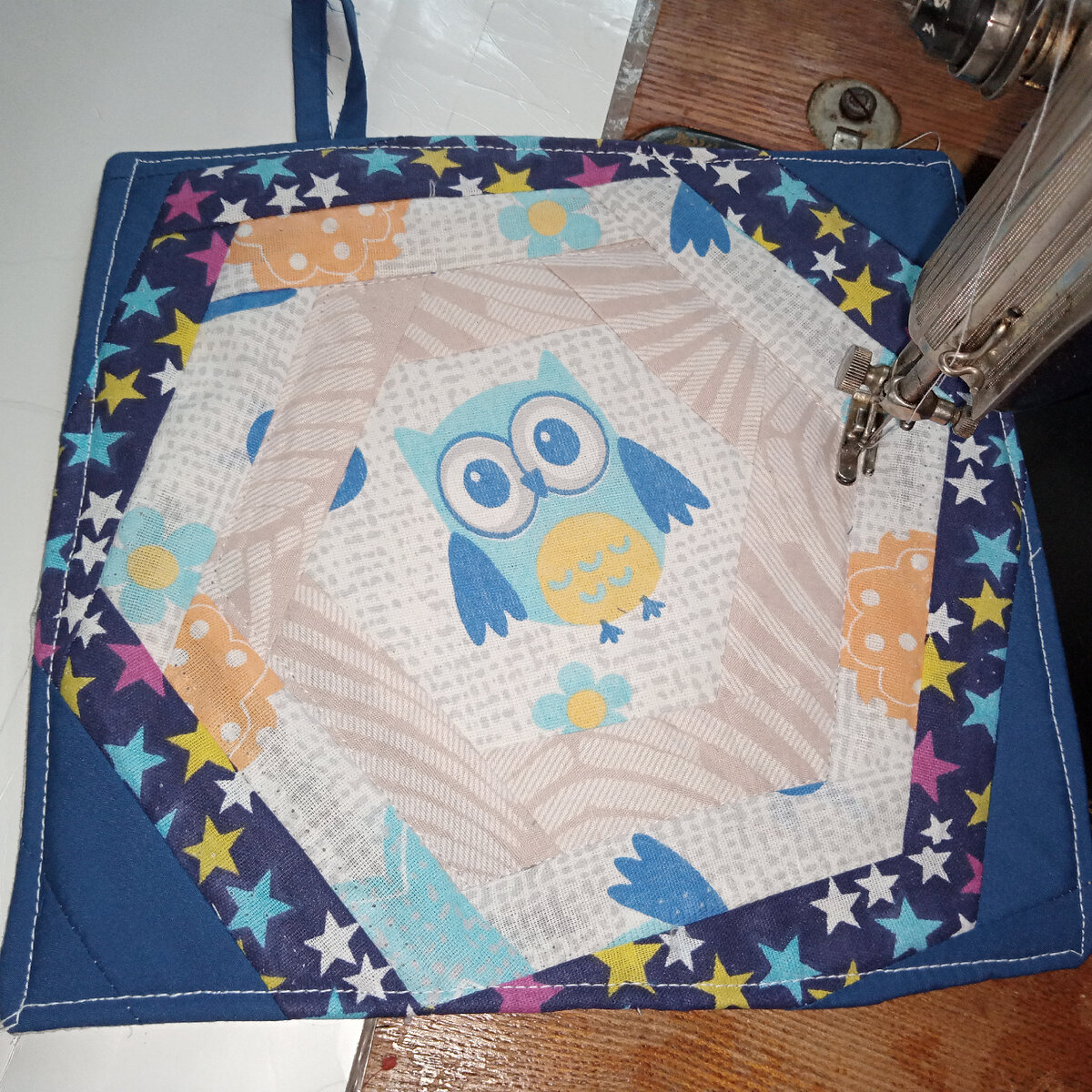 Если вы знакомы со швейной машинкой и имеете лоскуты ткани, то такую прихватку сможете легко повторить. Прихватка нужна каждой хозяйке, покажу пошагово, как сшить по кругу такую красоту. Начинаю шить с подбора тканей, так чтобы подходили по цвету. Например, как у меня с голубым и синим оттенком. Понадобится: Квадрат утеплителя, ткань на подкладку, полоски шириной 3 см, шестигранник в центре которого у меня совенок. Пришила белую ткань на подкладку, потому что у меня серединка тоненькая и просвечивает. Укладываю сову в центр квадрата и начинаю обшивать полосками от светлого к темному по кругу. Обрезаю лишнее каждый раз Дошиваю все синим цветом, утюжу. Вешалка у меня готовая, прикладываю на блок, накладываю сверху квадрат лицом к лицу и прошиваю по кругу оставляю см 8 не прошитое отверстие. Обрезаю уголки и выворачиваю. Не прошитое место прошиваю на машинке или вручную. Вот такая прихватка получилась у меня. Попробуйте и у вас получится. Если есть вопросы, задавайте!