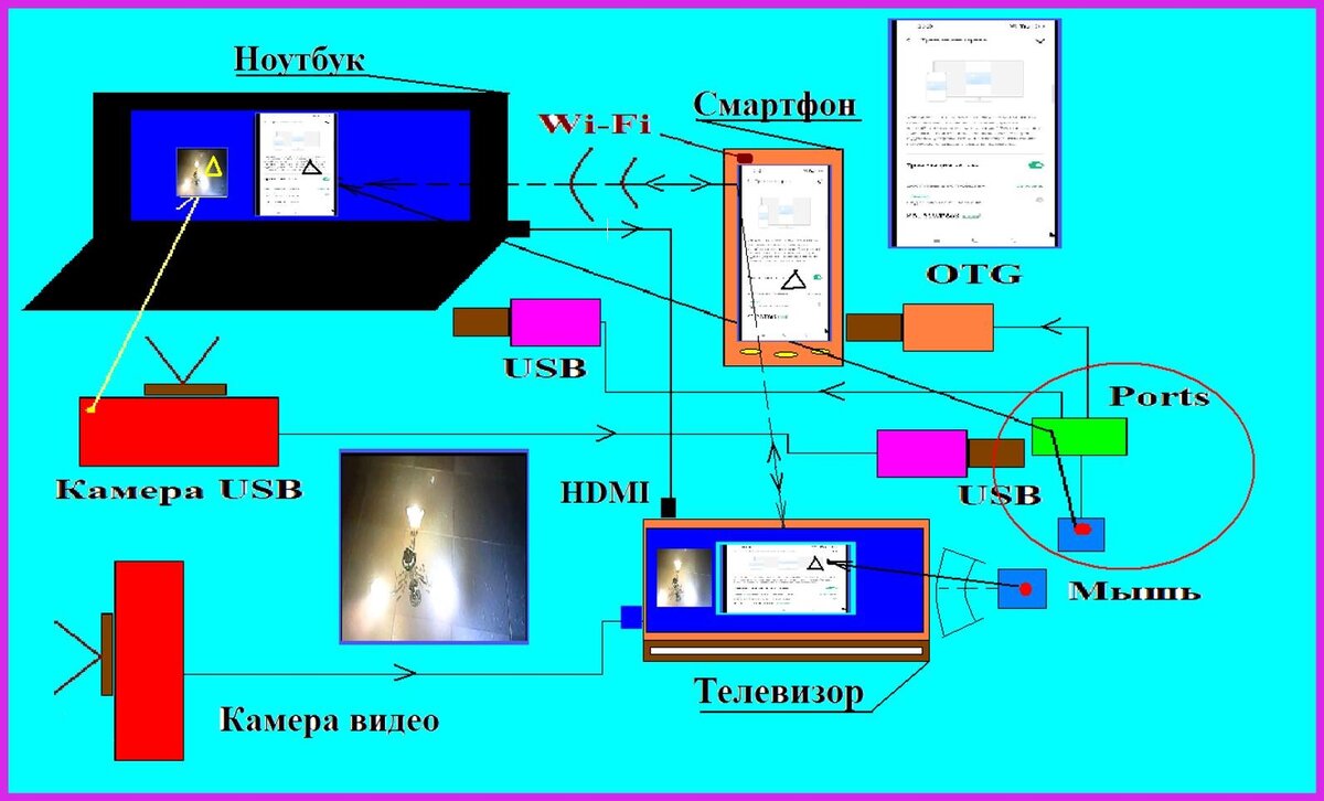 Желание управлять камерой смартфона дистанционно, навело на мысль купить пульт управления. Наконец решился и зашел в радиосалон, где предложили относительно недорогой вариант. Но при его проверке произошли трудности в настройке, и покупку решено было отложить, до определения причин. Но потом попалась ранее составленная схема организации управления и передачи изображения, при которой захотелось сказать: "Эврика". Идея заключалась в том, что управление смартфоном, можно организовать с помощью "мышки", как проводной, так и беспроводной через OTG, а визуализацию можно организовать, через программное обеспечение связи с ноутбуком (MyPhoneExplorer), которая позволяет "мышкой" управлять камерой с экрана ноутбука, или другим смартфоном (RemoDroid) через точку доступа Wi-fi.