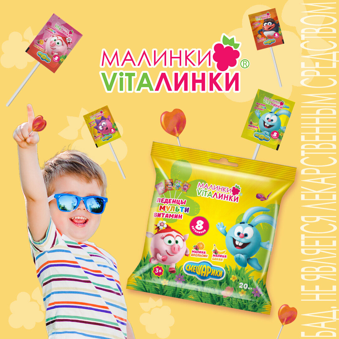 Комплекс витаминов для детей от 3 лет «Малинки-Виталинки мультивитамин» в форме леденцов на палочке — это вкусная порция энергии и бодрого настроения на каждый день. ● 8 витаминов в составе: A, Е, С, D3, В6, В12, B3 (ниацин), B7 (биотин) в дозировках, подобранных под суточные потребности растущего организма. ● Летние ароматы «малина-апельсин» и «малина-банан» дарят приятные эмоции и помогают привить ребенку полезную привычку принимать витамины. ● Натуральные красители и ароматизаторы в составе и бумажная палочка леденца — все продумано для безопасности вашего малыша. Мы хотим, чтобы леденцы на палочке «Малинки-Виталинки Мультивитамин» были доступны для всех, поэтому мы начали сотрудничество с крупнейшими интернет-магазинами OZON и Wildberries. Купить леденцы «Малинки-Виталинки Мультивитамин» в пакете по 20 штук можно любым удобным для Вас способом: - в аптеках вашего города; - на сайте аптека.ру; - на Ozon; - на Wildberries. Переходите на сайт https://malinkivitalinki.ru/ и выбирайте