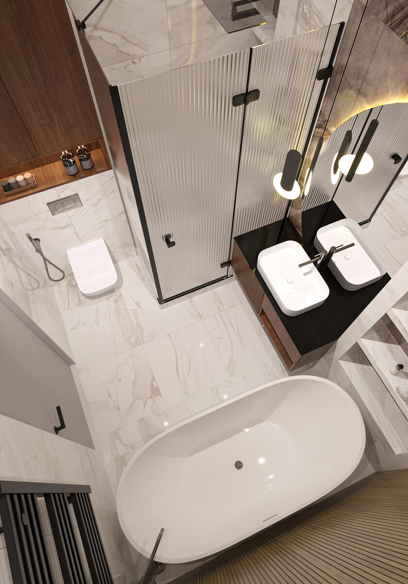 Ванная комната – это помещение, которым владельцы пользуются несколько раз в день, а значит, интерьер комнаты должен быть не только красивым, но и с продуманной эргономикой. Конечно, размещение сантехники и других предметов в ванной площадью 5 метров и 25 будут отличаться, но есть несколько базовых правил, которые нужно соблюдать для комфортного проживания. Правила эргономики зависят от пропорций человеческого тела. В ванной обязательно нужно продумать разные сценарии освещения, так как комната выполняет несколько задач, и учесть вопросы вентиляции и гидроизоляции. Еще один важный момент – это инспекционные люки. Их можно замаскировать с помощью различных дизайнерских решений, но доступ к ним должен быть свободным. Системы хранения в ванной должны быть максимально продуманы, и мы всегда рекомендуем делать их закрытыми, чтобы предотвратить запах бытовой химии и т.д. Каждый интерьер требует индивидуального подхода, и в зависимости от потребностей владельцев, в ванной могут размещаться ра