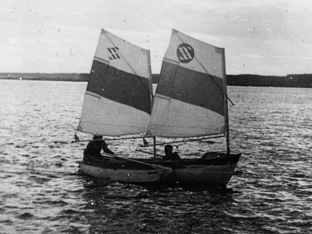 Переоборудованная гребная лодка "Кефаль", шпринтовые паруса, пенопластовые поплавки... Кстати, автор лодки - великолепный мастер и очень хороший человек Альфер Нурович Ягудин. Это он меня втянул в любительское судостроение. Вчера (6 марта 2023 года) я с прискорбием узнал о его кончине... Светлая память Альферу! Земля ему пухом!