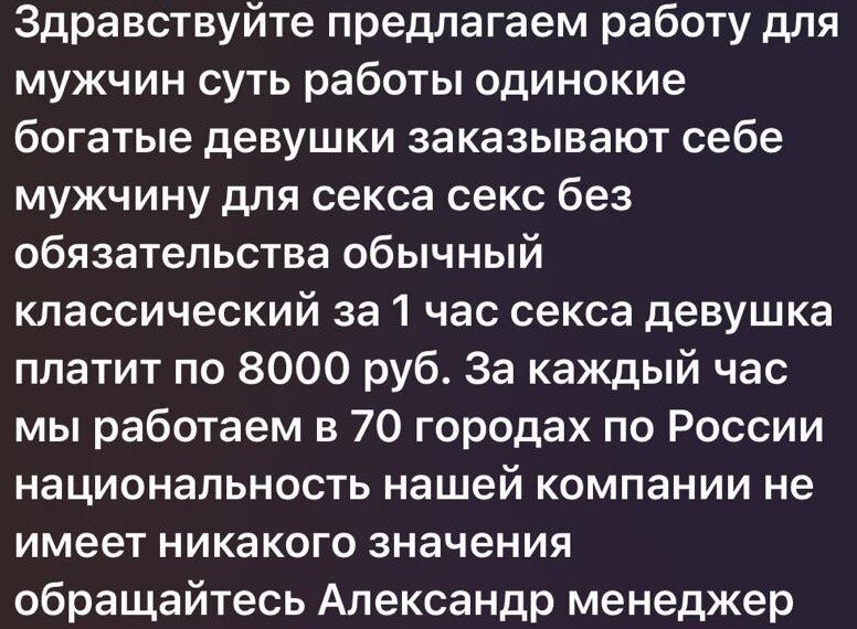 Мужская любовь. Какая она реальная или продажная? Существует ли она и какая от неё польза женщинам? Сегодня расскажу историю про то, как я решился на один эксперимент, косвенно связанный с мужской любовью. Часто работая с запросами построения взаимоотношений, я не смог не отреагировать на такое вот объявление в одном из известных мессенджеров. Дело было следующим образом, на просторах "Всемирной сети" я искал некую стабильную материальную независимость для себя и своей семьи, иными словами подработку по найму и наткнулся на данное предложение. Так, как в начале я подумал, что это чья-то шутка, я написал: хочу работать. На другом конце "провода", человек с кавказкой акцентом, в кратце объяснил суть дела. Материально независимые дамы до 60 лет, иногда очень скучают по мужскому вниманию и готовы щедро оплачивать услуги 18+. Для того чтобы попасть в "штат" я должен был предоставить мои фото и ждать ответный звонок. в этот же день, ближе к 10 часам вечера, мне пришло сообщение с фото девушк