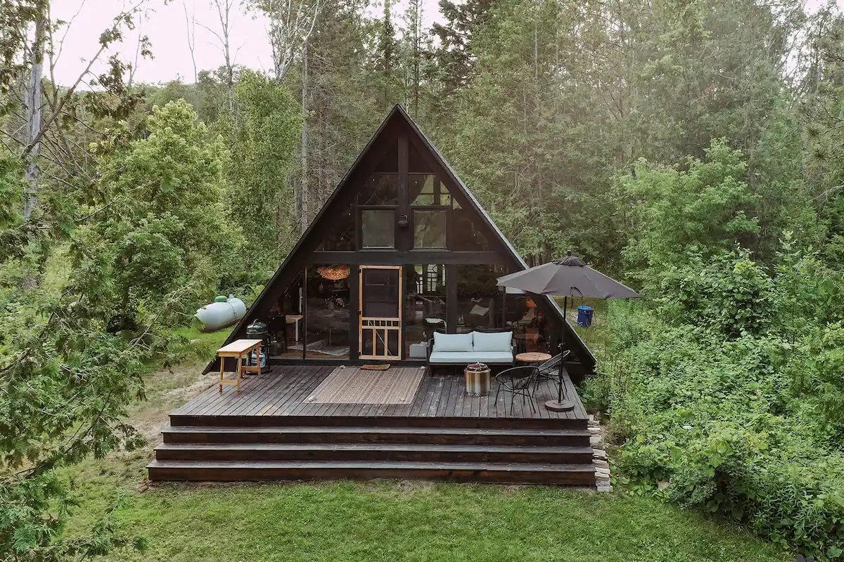 Собрали фото А-фреймов в разных исполнениях, которые предлагают арендовать для временного проживания в разных уголках Соединенных Штатов. В статье большое количество фотографий и немного теории о том, что представляет из себя А-фрейм, и какие вариации домов-шалашей встречаются чаще всего. А-фреймы в США пережили первую волну популярности еще в середине прошлого века. В Советском Союзе такие дома-шалаши часто использовали как сезонное жилье для баз отдыха, санаториев и пионерских лагерей. А в последние годы интерес к подобным проектам снова возрос по всему миру: Fernside Aframe, Indian River, Мичиган А-фрейм переводится как «дом в форме буквы А». Можно сказать, что а-фрейм не имеет внешних стен — он состоит из крыши, скаты которой опускаются практически до земли, и фронтонов — они же фасады. Поскольку окна в таком доме зачастую располагаются только на фасадах, передний обычно имеет панорамное остекление. Но в крыше могут быть дополнительно установлены мансардные окна, особенно в домах с