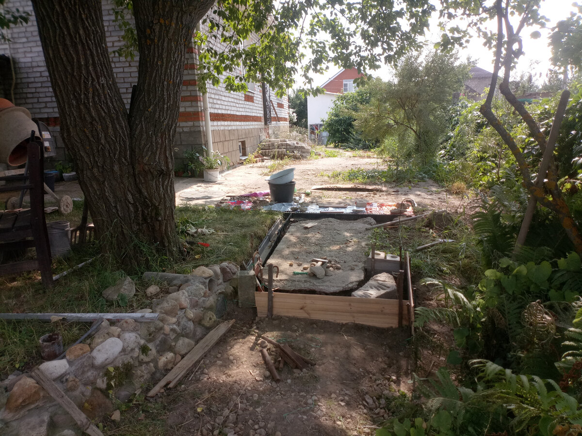 Залили верхний, ближний к дому, конец плиты, которая поначалу планировалась частью дорожки. А потом превратилась в первую ступеньку))