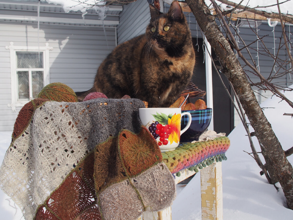07 Ирина М.: Фотосессия на снегу у речки и дома... Главная заказчица Клуша застеснялась и не стала фотографироваться, пришлось старшей Плюше отдуваться))) Закончилось, правда, массовой дракой (в съемку не попала). Итак, связано 22 квадратика из 40. Т.е. фактически верх коврика готов (20 кв.) Осталось связать изнанку. Отпаривать не буду, жевать удобнее) 2 задание.
