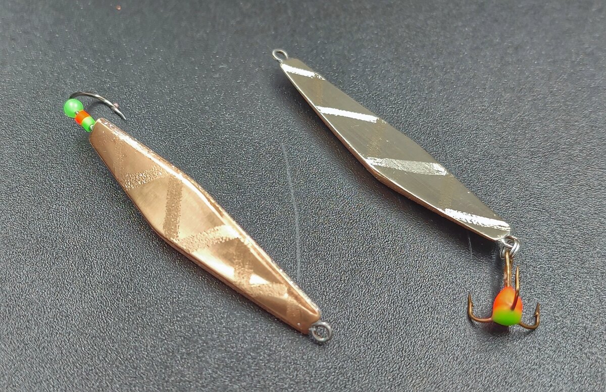 Привет, друзья! Как обычно, к концу сезона много новинок приходит на тест от Мастеров. И сегодня хочу поделиться и известными блеснами и весьма оригинальными, каких даже я еще не встречал) И начнем с серии Ельчиком. Блесна Виталия Павловича Сосновских стала очень популярной еще при жизни автора. И сейчас популярность этой блесны на высоте. Многие пытаются ее делать. У кого то лучше выходит, у кого то хуже. Кто то меняет ее параметры. Блесна очень хитрая по форме - там и переменная толщина по ширине блесны и изгиб есть. И вот сейчас держу в руках 4 блесенки таких. Впайка и подвес, большая и маленькая. Уж не знаю почему, но половив на разные Ельчики в этом году, мне хочется на впайке крючок максимально утопить в тело блесны. И для размера более 40мм я бы поставил двойную впайку. Свои хотелки передал Мастеру и, надеюсь, к сезону будет уже модернизированные впаечки. А подвесы вполне себе рабочие оказались и без модернизации. Еще один Мастер (Александр Тяпков), многим уже известный по "Гвоз