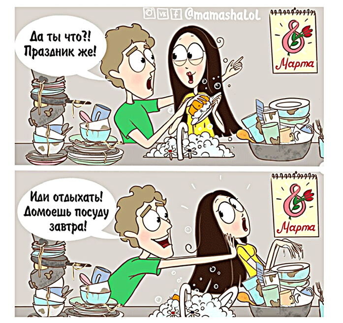 Наступил международный женский день. В честь праздника вас ждёт юморная подборка комиксов от мамы - художницы. Яркие и весёлые истории от современной и жизнерадостной Саши Советовой. Художница живёт в Москве и публикует свои жизненные комиксы под ником mamashalol. Прикольные ролики и комиксы можно полистать тут: дзен, vk.com, tiktok, pikabu.ru, t.me. Герои историй её семья - дочки, сын, муж и даже кот. Эти комиксы очень милые, жизненные и забавные. В них легко увидеть свою семью или друзей. Так давайте посмотрим прикольные комиксы о семейке Советовых, чтобы проникнуться отличным настроением и атмосферой праздника. Сегодня же праздник! Муж проявляет заботу и советует отложить домашние дела до следующего дня. Ещё бы сам взялся за уборку - тогда вообще идеальный праздник! Сюрприз Но у него есть идея "получше". Приготовить что-нибудь вкусненькое для любимой жены. Дети тоже помогают. От души стараются. После такого подарка у мамы прибавится хлопот... Визит гостей поможет чистоте Придётся ус