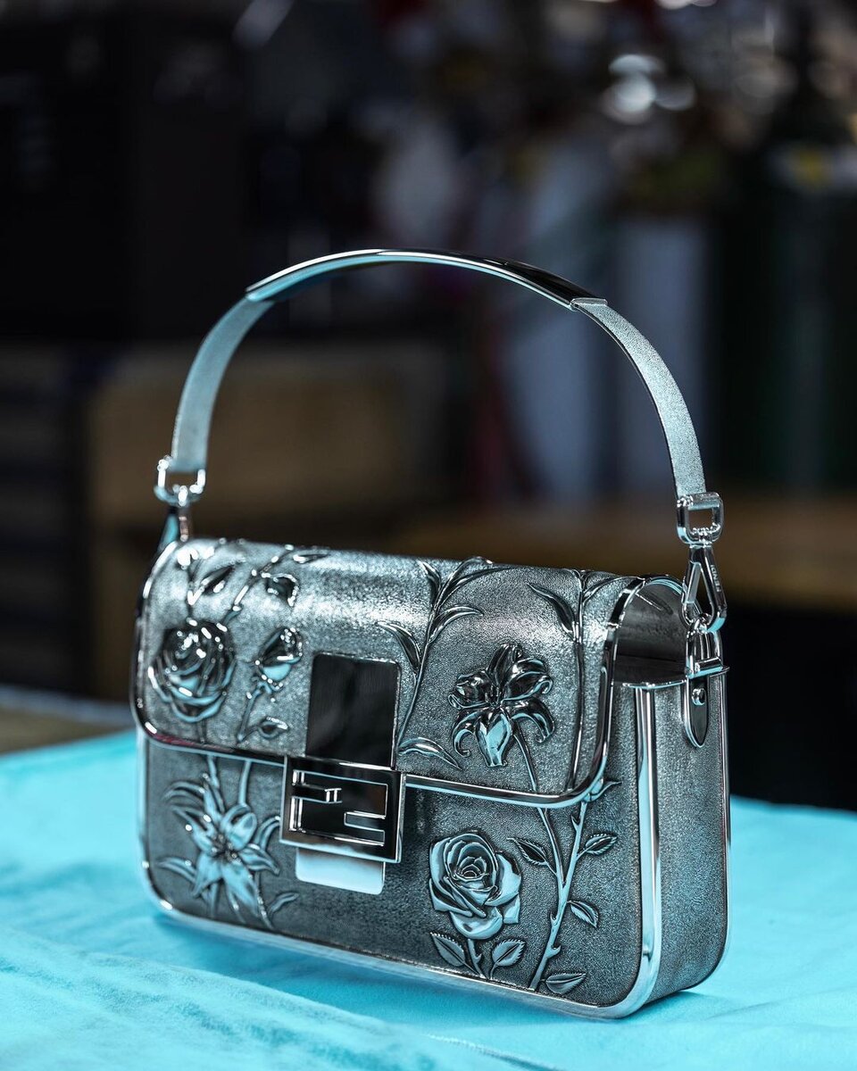 Давайте начнем это утро с музейных экспонатов. А точнее со специально выпущенной брендами Fendi и Tiffany & Co. сумки в честь 25-летия Fendi Baguette, выполненной полностью из серебра. Отличный вариант увековечить свой продукт в истории моды и искусства. В социальных сетях брендов появились фотографии сумки Fendi Baguette из стерлингового серебра с цветочным орнаментом, выполненной в единственном экземпляре. На сумке выгравированы лилии и розы — национальные цветы Италии и символический цветок штата Нью-Йорк. Мастера американской ювелирной мастерской использовали традиционную технику чеканки. На изготовление аксессуара ушло около 250 часов в течение четырех месяцев.