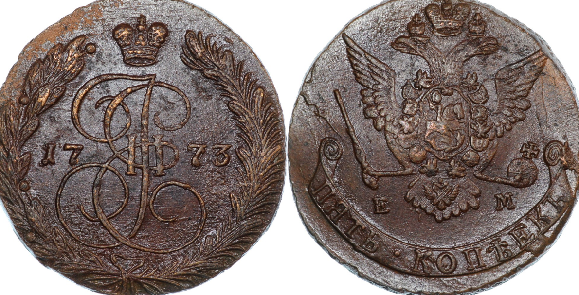 Всем, привет! Меня зовут Лев. Я являюсь нумизматом. Сегодня хочу обсудить еще одну очень интересную монету. 5 копеек 1773 года. Монета этого типа с вензелем Екатерины II выпускалась на Екатеринбургском монетном дворе в 1763-1796 годах. В 1797 году по указу Павла I производилась перечеканка 10-копеечников образца 1796 года в пятаки теми же штемпелями с датами "1791", "1793", "1794" и "1795". На аверсе монеты изображён вензель Екатерины II, составленный из букв "I" (императрица), "Е" (Екатерина) и римской цифры "II". Наверху императорская корона. По бокам указан год, разделённый на две части - "17" и "73". Окружают изображения две ветви, связанные внизу бантом.