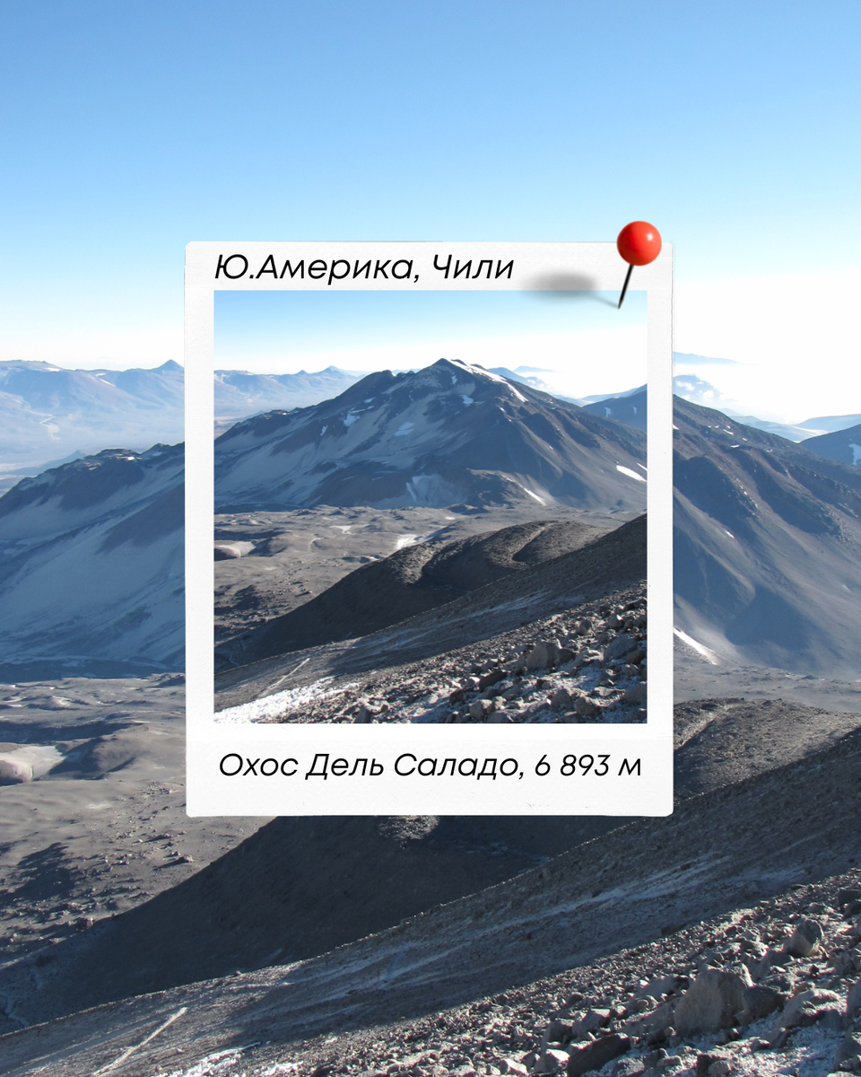 Если сравнить её с программой «7 вершин», в которую входят высшие точки каждой Части Света, программа с вулканами чуть проще, но не менее крутая и насыщенная. Охос Дель Саладо — 6 893 м, Южная Америка, Чили.