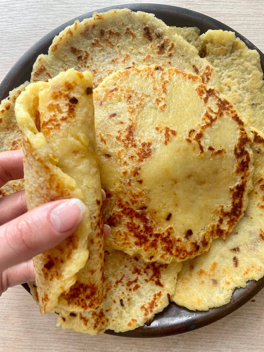 Можно даже тем, кто не употребляет в пищу подсолнечное масло🤗 ИНГРЕДИЕНТЫ: картофельное пюре 500 г мука 125 г Жареный лук или порезанный укроп по вкусу соль по вкусу ПРИГОТОВЛЕНИЕ: У меня картофель в мундире. Я его очистила и натерла на терке. Высыпаем к картофелю пшеничную муку, добавляем по желанию жареный лук или укропчик, солим по вкусу. Формируем массу в «колбаску». Если не формируется, можно добавить немного подсолнечного масла. Режем колбаску на кругляши, раскатываем в лепешки. Обжариваем на сухой сковороде в течение двух минут с двух сторон. Можно готовые лепешки смазать маслом, но не обязательно. Такое блюдо можно подать просто как блины, или использовать как основу для роллов, рулетов, вместо лаваша. Начинка рыбная или овощная.