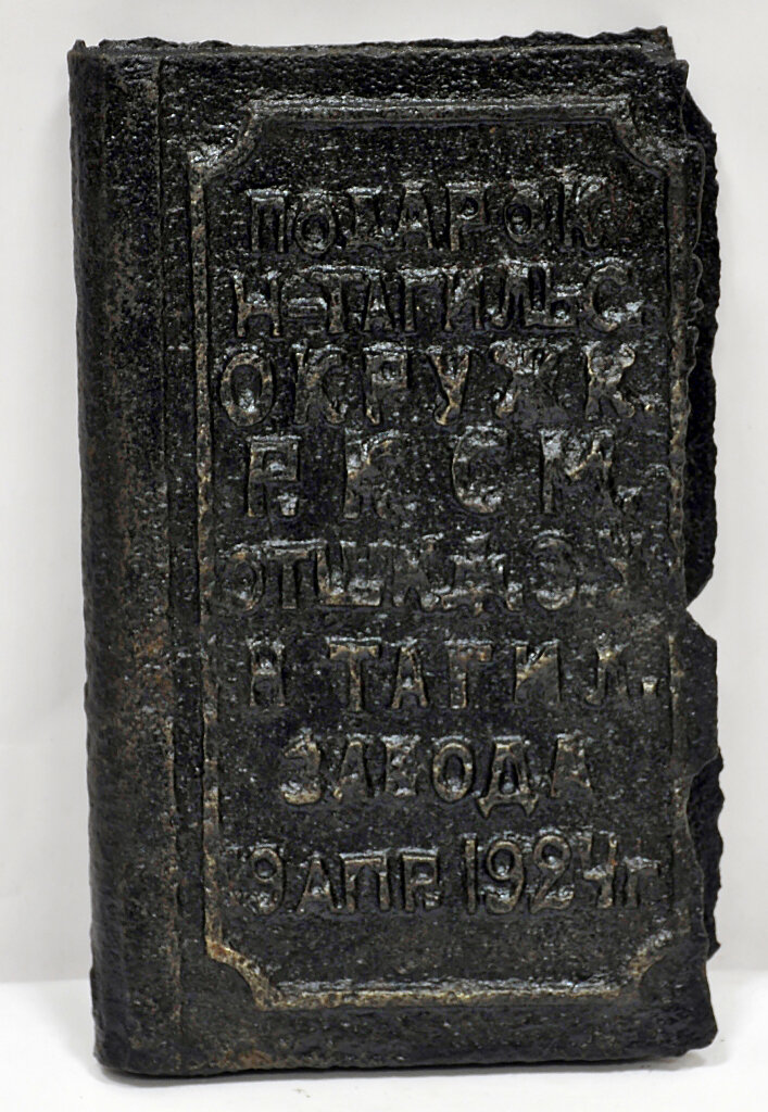 В 1980 г., 25 апреля, водитель Нижнетагильской организации «Горзеленхоз» Василий Ильич Юрьев принес в Нижнетагильский краеведческий музей любопытный предмет – чугунную плиту в виде книги с рельефной надписью.