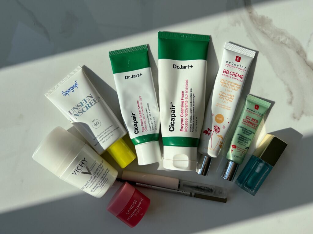 Если перелет недолгий, то я наношу свой повседневный макияж. Использую тон BB Cream от Erborian. Он почти не виден на коже, но при этом перекрывает легкие покраснения.