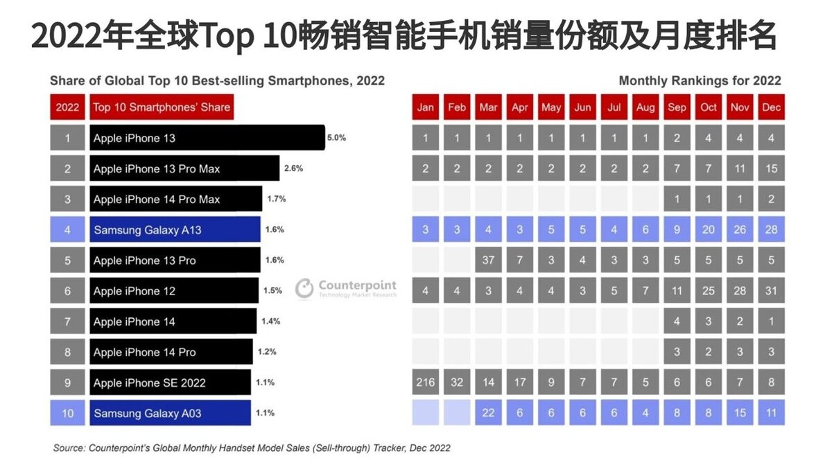 Исследовательское агентство Counterpoint Research посчитало, какие смартфоны в 2022 году отгружали больше всего. В первой десятке сразу восемь айфонов и два самсунга стартовых линеек — Galaxy A13 и Galaxy A03 за $150 и $100 соответственно. Первые восемь месяцев лидерство уверенно держал iPhone 13. За ним был iPhone 13 Pro Max. Но с наступлением сентября они были смещены. Первое место занял iPhone 14 Pro Max, удерживая его вплоть до ноября. Дальше — спад из-за ковидных ограничений в Китае. Тогда Foxconn не смог производить достаточное количество моделей. При этом уже с декабря мы можем увидеть, как iPhone 14 начал набирать аудиторию. Малые отличия от «тринашки» не интересовали покупателей — они хотят больше самых новых айфонов. Интересен в этом рейтинге iPhone SE. Хоть там и есть пометка, что речь о модели 2022 года, но, судя по всему, всё-таки и о прошлой версии тоже. И даже самый древний никому не нужный айфон из прошлого тысячелетия в итоге кому-то всё-таки нужен. Вот чудеса!