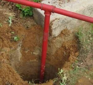 - когда труба достаточно заклубиться и останется торчать лишь один её конец, на него накручивают другую трубу, после чего продолжают бурение скважины до нужной глубины.
