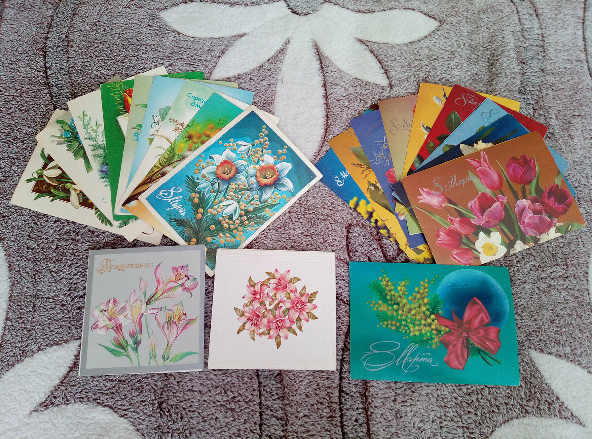 Всех милых дам, моих читательниц, поздравляю с наступающим 8 МАРТА! Счастья, любви, улыбок и всех благ! В честь такого замечательного праздника захотелось вспомнить годы СССР, когда доступность вот так вот запросто поздравить была ограничена. Если хотели быстро отправить весточку, то посылали телеграмму, или загодя писали письмо и в конверт дополнительно вкладывали открыточки. Даже телефон далеко был не у каждой семьи. Открытки были и с нарисованными цветами и с композициями их живых цветов. Выглядели примерно одинаково. У меня их целая куча. Некоторые только для общего вида выложила веером. Но среди множества открыток есть интересные, на мой взгляд. Вот тут не просто цветы, а земной шарик, корзинка с цветами, женщины с любой точки мира, весенние зарисовки в виде бересты или пейзажа. Даже вертолетик есть, доставляющий почту. Почти как Дед Мороз 😊 А здесь мама с ребёнком. Видимо, ребёнок - девочка, олицетворяющая будущую женщину. И ещё мне понравилась открытка с расписным рисунк