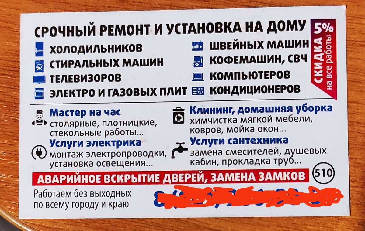 Как то раз в авито я увидел объявление “требуются ученики мастера по ремонту бытовой техники, обучение бесплатно за счёт компании”. Так как у меня было свободное время, я решил пойти и отучиться на мастера по ремонту стиральных машин, посудомоечных машин и бойлеров (водонагревателей). Тем более, это был интенсивный курс обучения который длился всего лишь 7 дней с 9 до 12, по 3 часа в день. Первый обман с которым я столкнулся на фирме – это то, что на самом деле обучение всё таки не бесплатное, а стоит 7 т.р. и вычитается с первых заказов. Да, эта фирма обучала и в дальнейшем трудоустраивала, а точнее обеспечивала заявками по ремонту бытовой техники. Надо отдать должное нашим учителям, реальным мастерам, которые всю неделю разжёвывали нам тонкости ремонта бытовой техники. Большое им спасибо! В предпоследний день учёбы у нас был экзамен с теорией и практикой, как положено. А последний день был посвящён продажам, а по факту алгоритму развода заказчиков. На доске кабинета висела таблиц