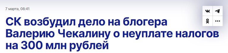 В Следственном Комитете Москвы возбудили дело о неуплате налогов в сумме 300 млн рублей на блогеров - семейную пару Валерию и Артема Чекалиных, которые занимались организацией фитнес-марафонов посредством с недавних пор запрещенной и признаной экстремистской в России социальной сети, через аккаунт с более 10 млн подписчиков. При прочтении заголовков в СМИ создается впечатление, что эти люди получали доход и не платили налоги. Но, если вникнуть в суть, оказывается, нет: налоги они платили со всех своих доходов, но власти посчитали, что платили недостаточно. А именно: деятельность блогеров была оформлена на ряд родственников-ИП с упрощенной схемой налогообложения, которая допускается для бизнеса с доходом не более 150 млн рублей в год. Когда один ИП вырабатывал свой лимит - открывался следующий, и т.д. Условно: какие-то фитнес-марафоны организовывал один ИП, следующие - уже другой, следующие - третий. Налоговая сочла это дроблением бизнеса, что запрещено, и насчитала неуплаченных налогов
