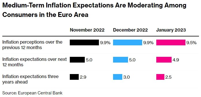 Трехлетний показатель замедлился до 2,5%. Евро отреагировал небольшим ослаблением. Фокус сегодня направлен на Пауэлла Ожидания потребителей в отношении инфляции в еврозоне «значительно снизились», по данным Европейского центрального банка, что подкрепляет призывы к замедлению темпов повышения процентных ставок. Ожидания на три года вперед упали до 2,5% в январе с 3% в декабре, сообщил во вторник ЕЦБ в своем ежемесячном обзоре. Снижение наблюдалось и на горизонте следующих 12 месяцев — до 4,9% с 5%. Откат происходит чуть более чем за неделю до того, как политики должны установить стоимость заимствований с повышением депозитной ставки на полпункта до 3%, что почти гарантировано. Данные последовали за худшими, чем ожидалось, показателями базовой инфляции на прошлой неделе, которые достигли рекордного уровня и приободрили ястребов, выступающих за длительное ужесточение денежно-кредитной политики. Среднесрочные инфляционные ожидания потребителей в зоне евро снижаются. Источник: Европейский