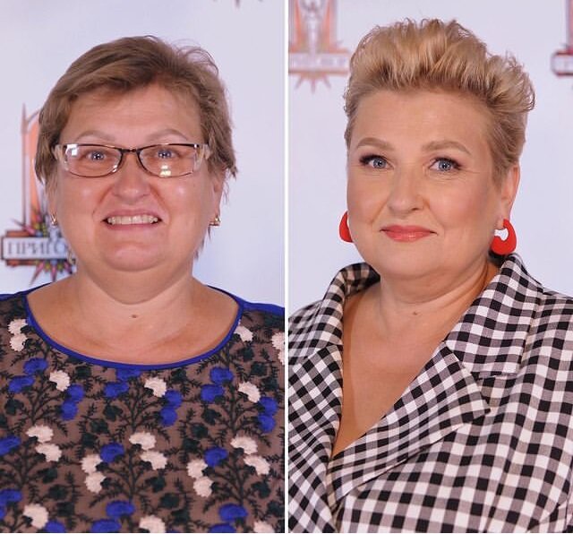 После 50 лет многие женщины отказываются от длины волос в пользу короткой стрижки. У женщин с круглым лицом или его выраженной полнотой и дряблостью могут возникнуть проблемы с подбором правильной причёски. Стилисты «Модного приговора» демонстрируют, что даже крупные женщины 50+ могут носить короткие стрижки. Главное — подобрать оттенок волос, правильную укладку и не забыть про корректирующий макияж. Самое лучшее преображение из подборки из-за наибольшей разницы до и после, а также неоспоримого успеха стилиста. Отличный пример того, как могут портить образ старомодные очки, и как его меняют в лучшую сторону моложавая стрижка, чёрно-белая клетка и акцентные серьги. Эта дама, которой на передаче было 64 года, не могла жить без леопарда. Стилисты показали ей, что такая жизнь вполне возможна, а модной и привлекательной можно быть при помощи небанальной стрижки. 54-летняя героиня была скромной дамой, которая комплексовала из-за лёгкой полноты и одевалась в старомодные вещи, которые делали и
