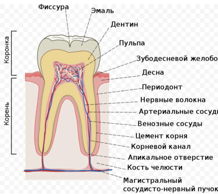 Зуб состоит из трех основных слоев: 1)Эмаль (наружный слой) - это твердая, белая, несколько прозрачная защитная оболочка зуба, которая защищает от повреждений и кариеса. 2)Дентин (средний слой) - это желтовато-белый слой, который находится под эмалью. Он состоит из микроскопических трубок, которые соединяют поверхность зуба с нервными окончаниями в пульпе зуба. 3)Пульпа (внутренний слой) - это мягкая ткань в центре зуба, которая содержит нервы, кровеносные сосуды и соединительные ткани. Пульпа является жизненно важной для здоровья зуба, так как питает и обеспечивает его рост. Кроме того, зуб содержит корень, который расположен в костной ткани челюсти или верхней челюсти и удерживает зуб в правильном положении в ротовой полости. Корень зуба состоит из цемента, который покрывает корень и обеспечивает удержание зуба в кости.