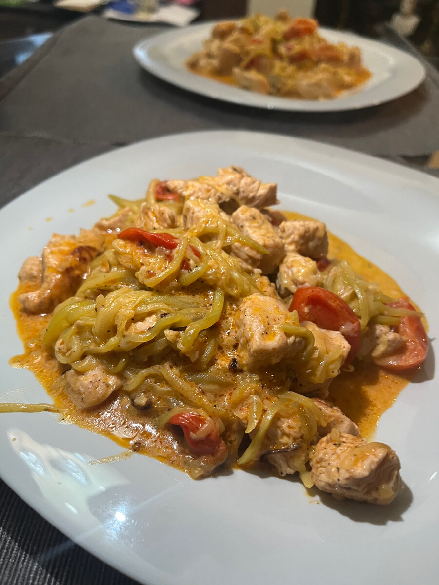 Я обожаю эту пасту, готовить ее около 40 минут. Кстати, индейку можно заменить на куриные бедра без костей или куриную грудку😉 Итак, вот что нам понадобится на 2-3 порции: 1. Грудка индейки 500 гр 2. Кабачки, лучше небольшие (удобнее натирать) 1 кг 3. Чеснок 5-6 долек 4. Сметана 3 ст. л. 5. Майонез 2 ст. л 6. Оливковое масло 4 ст. л 7. Помидорки черри 200 гр 8. Соль, специи (паприка, чилли, черный перец, итальянские травы) Сам процесс: