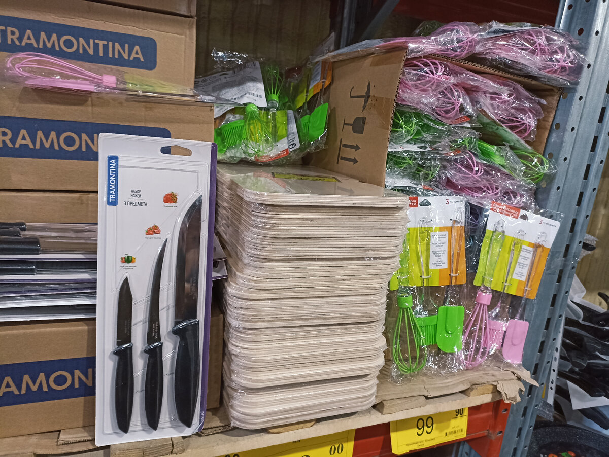 Приветствую вас, дорогие друзья и подписчики! Интенсивные поставки товаров в "Светофор", замечают все покупатели. И особенно это видно в хозяйственных рядах магазине, где постоянно идут перестановки. В этом обзоре, хочу поделиться с вами увиденными товарами для кухни и сада, которые недавно выставили в "Светофоре" города Новороссийск. Набор кухонных стальных ножей из 3 штук, с длиной лезвия 7,5 см, 12,5 см и 15 см. Цена 279 рублей. Столовые двухслойные салфетки "Лилия", в упаковке 100 штук. Цена 20 рублей. Универсальные салфетки для уборки из 10 штук, размером 30 см. Цена 100 рублей. Набор пластиковых контейнеров из 3 штук с крышками для хранения, объёмом по 1 литру. Цена 84 рубля. Средство для мытья посуды БИОЛАН с ароматом цитрусовых, в бутылке 900 грамм. Цена 81 рубль. Немного подешевела разделочная фанерная доска с рисунком, размером 21/31 см. Цена 76 рублей, а была 87 рублей. Эмалированная миска с цветными разводами объёмом 3,5 литра. Цена 156 рублей. Пластиковый раздвижной дуршла