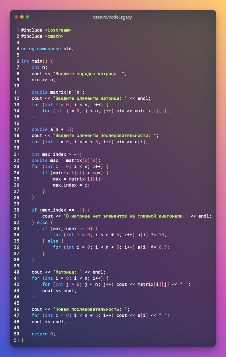 Задача: Даны натуральное число n, действительная квадратная матрица порядка n, действительные а1,...,an+5 . Элементы последовательности а1,...,an+5 домножить на 10, если наибольший элемент матрицы (в предположении, что такой элемент единственный) находится на главной диагонали, и на 0.5 в противном случае. Решение: Код работает следующим образом: Примечание: в коде предусмотрены проверки на наличие элементов на главной диагонали и корректность вводимых данных.