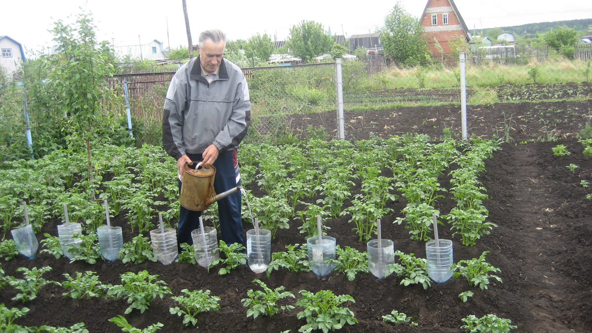Но сначала о корневой подкормке, поскольку считаю её недостаточной. Пробовал подкармливать посевы и во второй раз, но столкнулся с проблемой. Поскольку картофель уже был окучен, при подкормке с его гребней весь раствор стекал в междурядья, минуя корневую систему. Получался напрасный труд. А если поливать пусть малыми дозами непосредственно в центр куста, то была опасность его стебли сжечь. В прошлом году, правда, ещё не на всей делянке, я попробовал изменить свою технологию в пользу корневой подкормки. Стал проводить её вторично одновременно с поливом картофеля и после его окучивания, пользуясь тем, что кусты были ещё не совсем высокими. Взял 5-литровые пластиковые бутылки, обрезал днища и, открыв пробки, установил их между кустами горловиной вниз, чуть-чуть вдавив в почву. Для устойчивости в горловину сразу воткнул штыри (можно железные, пластиковые, деревянные) на глубину 30-40 см и залил бутыли водой (для облегчения можно и из шланга). Затем удалил штыри, и вся вода через уже проделанные отверстия стремительно ушла вниз, увлажнив корневую систему соседних кустов. Потом в каждую бутыль из лейки налил заранее подготовленную подкормку. Повторюсь, одного ведра такой подкормки хватило на 10 кустов. Для удобства подкормки лучше всего использовать одновременно 10 бутылок из расчёта 1 литра раствора на куст, проводя её как бы конвейерно.