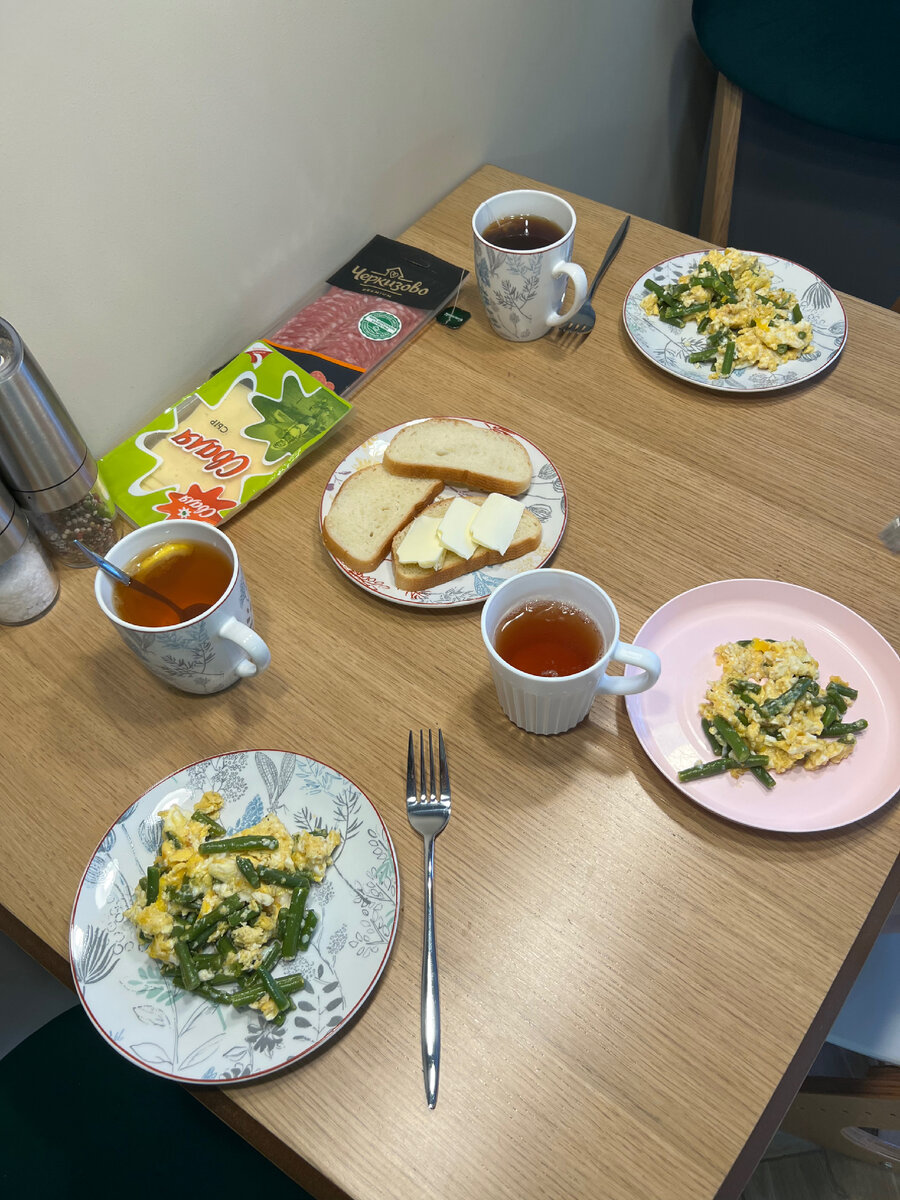 Пока не могу привыкнуть делать фотографии нашего меню. Сегодня вот только завтрак сфотографировала и перекус, но буду стараться впредь не забывать. На завтрак у нас была стручковая фасоль, обжаренная с яйцом. Давно не готовила такое блюдо. Дочка, правда, фасоль кушать не стала, хотя обычно ее ест. Еще бутерброды, колбаска и сыр, кто что хочет. На обед мы с дочкой доедали суп с фрикадельками, а муж вчерашнюю тушеную картошку. На перекус были фрукты - апельсин и банан. На ужин я отварила спагетти и сделала к ним тушеную куриную грудку с овощами в сливках. Также была нарезка овощей и брынза. На 9 месяце постоянно хочется кушать. Стараюсь не переедать, потому что прибавка и так уже 14 кг, не хотелось бы сильно больше набирать. Еще я сейчас практически не гуляю, мне рекомендовано больше лежать, поэтому физическая активность низкая. Ничего не поделаешь, ради малыша можно и потерпеть.