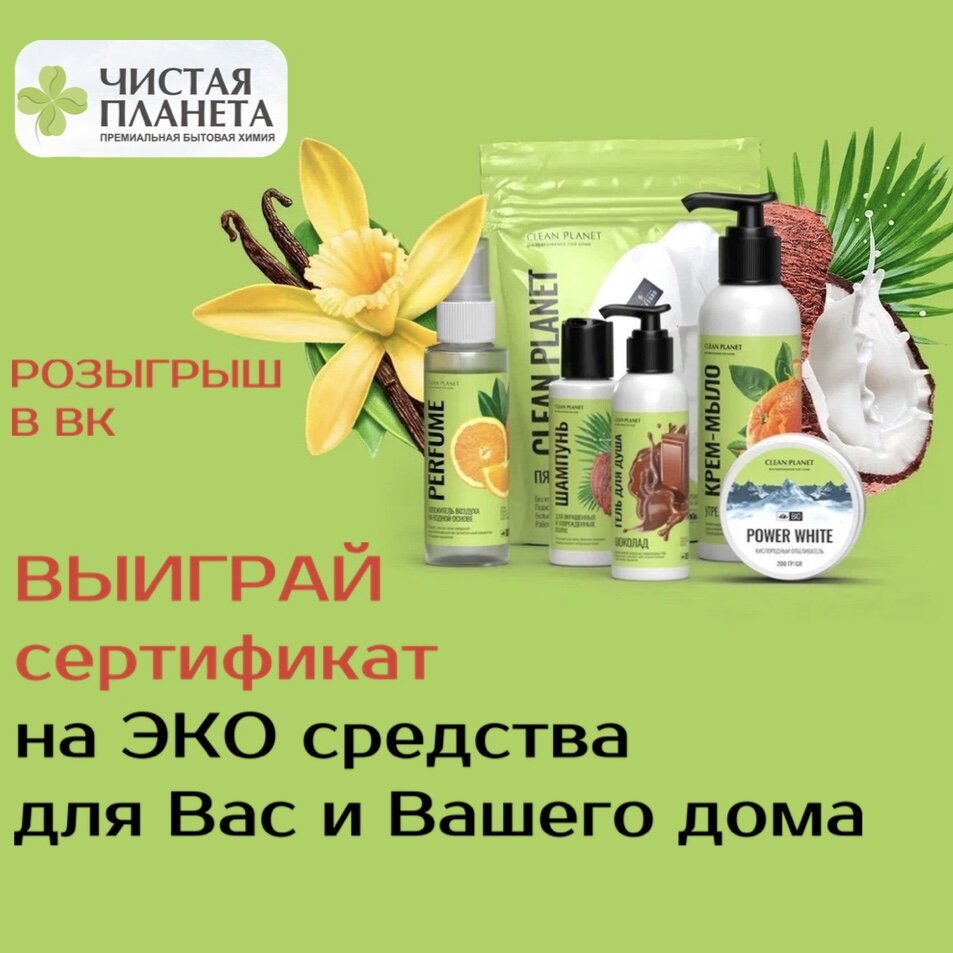 🌷Весенний розыгрыш в сообществе ВКОНТАКТЕ 🌷 Переходите в наше сообщество и выигрывайте призы🤗 Чистая Планета https://vk.com/chistaya.planetavk Дарим сертификаты на ЭКО средства для Вас и Вашего дома от Чистая Планета 💝20 победителей =20 сертификатов 🎁Призовой фонд: 💝5 электронных сертификатов номиналом 1000₽ 💝10 электронных сертификатов номиналом 500₽ 💝5 электронных сертификатов номиналом 300₽ ▫️Условия: Сроки проведения розыгрыша с 8 Марта по 15 Марта 2023г. 🍀Поделитесь этой записью с друзьями на странице вк 🍀Вступите в сообщество https://vk.com/chistaya.planetavk 🍀Ожидайте результаты. Имена обладателей призов узнаем 17 Марта 2023г. Победитель будет выбран рандомным способом, при помощи приложения «Рандомайзер» Не ударяйте запись репоста со стены ВКонтакте пока мы не проведём розыгрыш и не огласим список победителей. Желаем удачи! 🍀 Пусть повезёт именно Вам! 🤞🏽