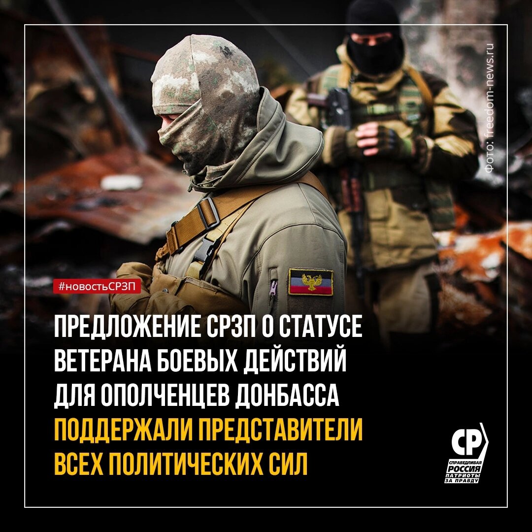 Группой парламентариев, включая сенаторов и депутатов всех фракций, был внесен законопроект о статусе ветерана боевых действий для ополченцев Донбасса. После принятия этой нормы статус ветерана и положенные льготы будут доступны всем, кто защищал юго-восток Украины с 2014 года. СПРАВЕДЛИВАЯ РОССИЯ - ЗА ПРАВДУ уже несколько месяцев настаивает на таком решении. Об этом шла речь и на встрече Председателя СРЗП Сергея Миронова с Президентом РФ. ☝ В результате представители всех политических сил, включая правящую, подключились к нашему предложению оформить социальные гарантии ополченцам Донбасса, оформив общий законопроект. В данном случае авторство не имеет значения. Важна лишь польза для граждан и восстановление социальной справедливости. Мы всегда настаивали на том, что приоритет нашей работы – благополучие русских людей. Для скорейшего достижения этой цели мы готовы работать с представителями всех политических сил. России быть сильной! 💪