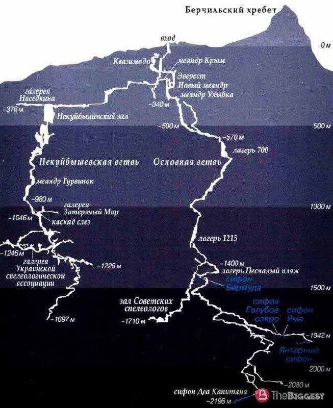 Эта уникальная пещера является самой глубочайшей на планете, ее глубина составляет 2196 м. Впервые о пещере узнали в 1960 году, когда спелеологам удалось спуститься на 95 метров, а только через 44 года учёные смогли преодолеть двухкилометровый рубеж. Этот природный феномен не изучен полностью: до множества гротов и тоннелей так еще и не смогли добраться. Представляю вам карту-схему уникальной пещеры.