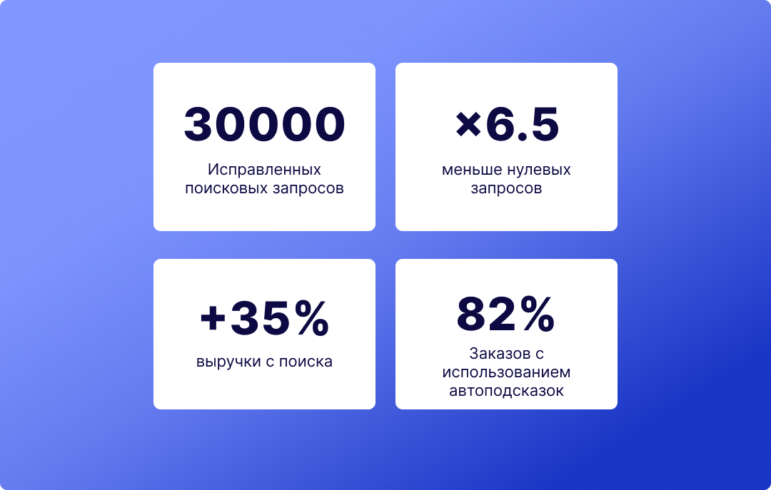 Боль интернет-магазина — когда покупатель закрывает сайт. Одна из популярных причин — это пустая выдача на поисковый запрос. Есть много факторов нулевой выдачи, например: С проблемой нерелевантной выдачи и невозможности поиска по артикулам к нам обратились наши партнеры из virage24.ru. Во многих узкоспециализированных интернет-магазинах покупатели ищут по артикулам, так удобнее и быстрее найти конкретный товар. Однако человек вряд ли будет смотреть весь каталог или искать по-другому, он просто уйдет. Про интеграцию Во время интеграции мы работаем с товарным фидом, который позволяет искать по артикулам и качественно разделять товары по категориям на странице поисковой выдачи.Полная интеграция с момента обращения до запуска заняла 14 дней. Мы интегрировали полный поиск, который включает в себя:Автоподсказки