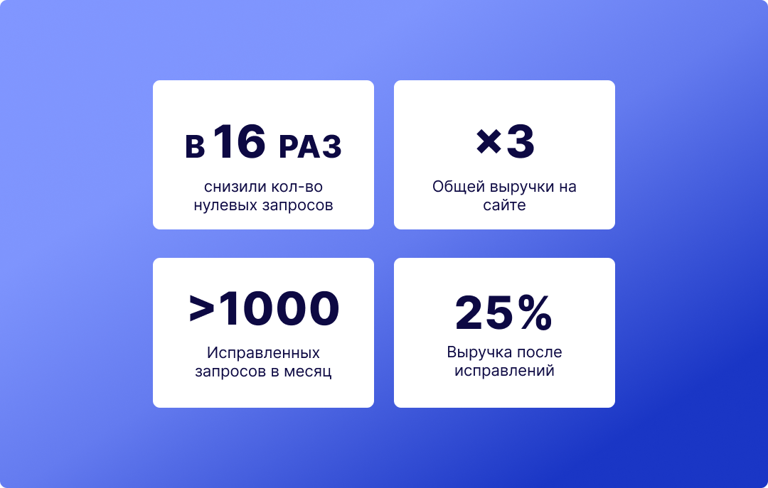 Как мы уже отмечали в нашем предыдущем кейсе, поиск — один из ключевых инструментов для сегмента DIY&Household, где до 49% пользователей используют его для поиска нужных товаров. Однако стоит отметить, что в 14% случаев покупатели вводят названия товаров с ошибками и опечатками. Это приводит к тому, что поиск выдает неверные результаты или не выдает ничего вовсе.