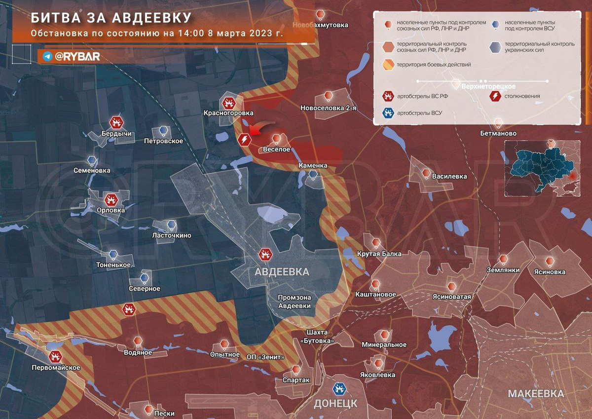 Севернее Авдеевки российские войска возобновили наступление на направлении Красногоровки. В ходе ожесточенных боёв у пруда и дамбы ВС РФ освободили село Весёлое и продвинулись дальше. Сейчас бои идут в районе лесополосы и у Красногоровского пруда.