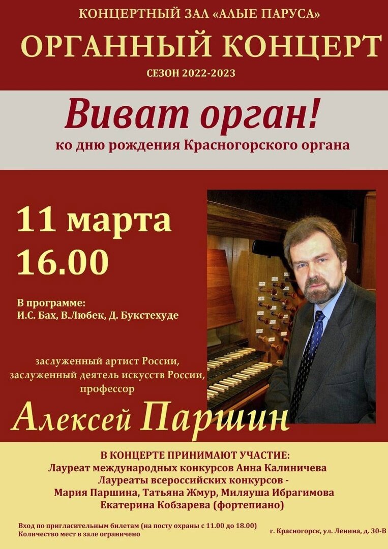 В Органном зале хоровой школы «Алые паруса» пройдет концерт «Виват Орган!», приуроченный ко дню рождения Красногорского органа. На концерте представят органные сочинения Иоганна Баха, Винсента Любека, Дитриха Букстехуде, Пьетро Йона и Перси Флетчера. А исполнят их заслуженный артист России, заслуженный деятель искусства России, профессор Московской консерватории Алексей Паршин и его ученики, лауреаты всероссийских конкурсов Мария Паршина, Татьяна Жмур и Миляуша Ибрагимова. Концерт состоится 11 марта в 16:00, адрес: Красногорск, улица Ленина, дом 30В. Приобрести билеты можно на посту охраны с 11:00 до 18:00. Телефон: 8 (495) 563-15-55.