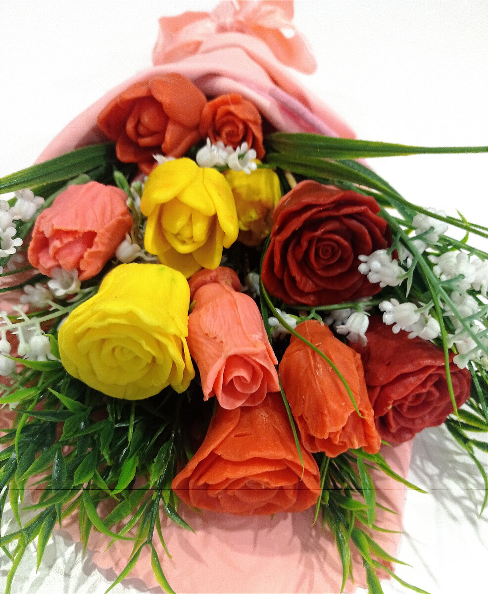 К 8 марта подарила подарки своим девочкам, самым близким и родным. А к подаркам от меня цветочки, но только эти букетики и цветочки мыльные..Так что пригодятся,когда вдруг мыла дома не будет. Так как я все пробую,то делала букетики впервые.И кажется получилось. Конечно сначала я приобрела заранее : 5. Шпажки бамбуковые 6. Зелень из пластика и веточку ландышей 6.Лист фоамирана для упаковки 7.Ленточку 8.Спирт или можно водку для сбрызгивания мыла при заливке,чтобы не .было пузырьков. Инвентарь: большая мерная чашка для мыльной основы,несколько чашек, чтобы замешивать разные цвета,клеёнка, микроволновая печь, силиконовые формы Сначала я сбрызгиваю формы спиртом. Заливаю подкрашенную основу с ароматизатором в форму, и опять сбрызгиваю спиртом.Минут через 10-15 застывает мыло , можно аккуратно вытаскивать из формы и заливать новое мыло. От яиц я оставила пару лотков ярких жёлтых пластиковых, помыла их,и складывала в ячейки, бутоны роз и тюльпанов,на просушку.чтобы хорошо подсохли.