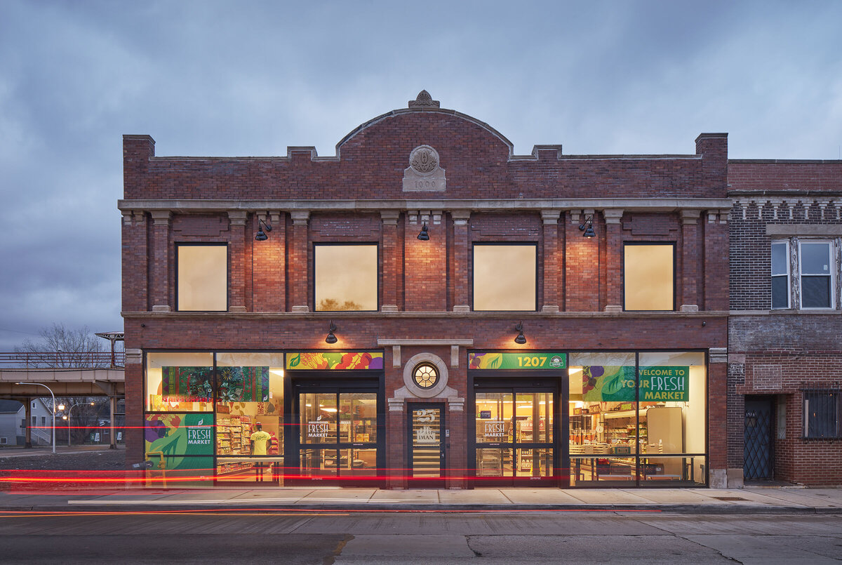 Возглавляя этот проект адаптивного повторного использования, Wheeler Kearns Architects превратили двухэтажное здание из красного кирпича, построенное в 1906 году, в новый общественный ресурс, созданный сообществом Энглвуд и для него. В рамках программы площадью 6400 квадратных футов разместился рынок свежих продуктов в кооперативном стиле, предлагающий продукты местного производства, полезные готовые к употреблению блюда, приготовленные шеф-поварами из Чикаго, небольшую столовую в помещении на первом этаже, а также офисы и п