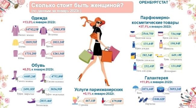 Оренбургстат посчитал минимальные затраты женщины на покупку себе в год одежды, обуви и парфюмерно-косметических средств, а также посещение парикмахерской. Продукты в данной статистике, когда речь идет о красоте, оставим за бортом насущным... Оренбурстат брал для анализа, чтобы посчитать, сколько стоит быть женщиной, цены января 2023 года и сравнивал с январем 2022 года. Итак, больше всего за год в Оренбуржье подорожали парфюмерно-косметические товары - на 37 процентов, ценники на одежду выросли за год на 13 процентов, незначительно прибавила в цене обувь, поход в парикмахерскую стал стоить дороже более чем на 5 процентов. Минимальный набор предметов гардероба в год, необходимый оренбурженке, - зимнее пальто, ветровка, юбка, платье, брюки, блузка, обойдется даме, по подсчетам статистиков, примерно в 25 500 рублей. Пять комплектов обуви на все сезоны - зимняя, осенняя, ботиночки, туфли и босоножки - будут стоить около 19 000 рублей. Новую сумочку прикупить обойдется в 3700