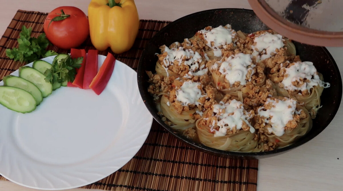 Сегодня приготовим макаронные гнезда с фаршем на сковороде. Это сытное и вкусное блюдо очень нравится детям. 1. Гнезда – 8 шт 2. Фарш – 300 г 3. Томатная паста – 2 ст.л 4. Соль, перец – по вкусу 5. Сушеный чеснок – 1\2 ч.л 6. Лук – 1 шт 7. Сыр – 80 г Для овощного фарша: 1. Морковь – 1 небольшая 2. Лук – 1 шт 3. Сладкий перец – 1 шт 4. Помидор – 1 шт 5. Соль, перец – по вкусу 6. Прованские травы – 1\2 ч.л Готово ! Приятного аппетита 🌸