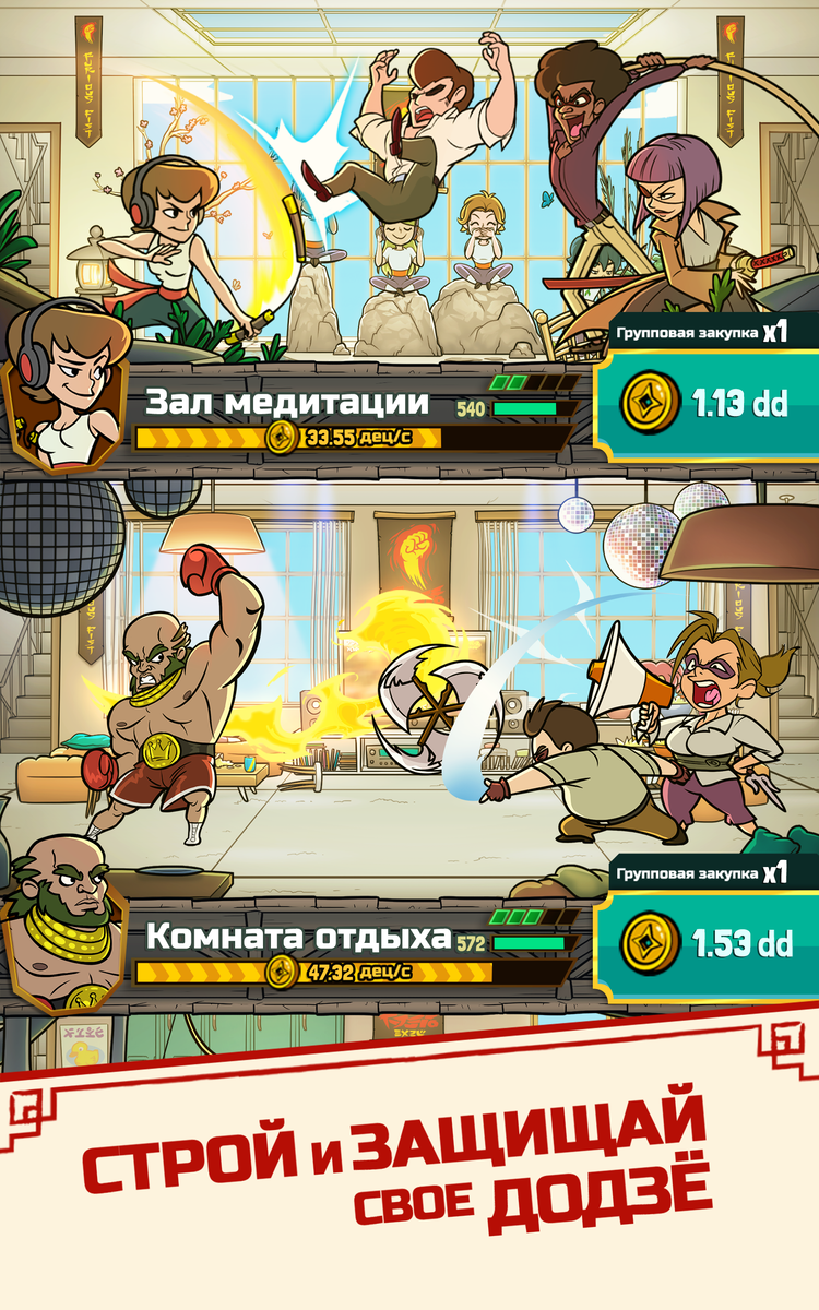 Kung Fu Clicker — это нетривиальный кликер для Android и iOS, в котором мы будем строить многоэтажные додзё-башни, где тренируются, а также занимаются медитацией и просвещением одаренные воины восточных единоборств. Игра получила необычный дизайн вертикальных локаций, качественное графическое оформление в рисованном стиле, отличную анимацию и забавное звуковое сопровождение. Смысл игрового процесса заключается в прокачке различных помещений и воинов, которые занимаются их охраной. Каждые несколько минут или секунд на улице появляется банда преступников, пытающихся захватить башню додзё. Во время их атаки мы можем сами нападать посредством кликов по антагонистам, а также доверять защиту этажей своим подданным. Правда, последние тоже должны регулярно улучшаться, но это не всегда зависит от наших желаний. Уникальная фишка этого кликера состоит в том, что в нем нашлось место для онлайн-битв. Мы можем примкнуть к одному из кланов, чтобы впоследствии испытывать на прочность башни других гейм