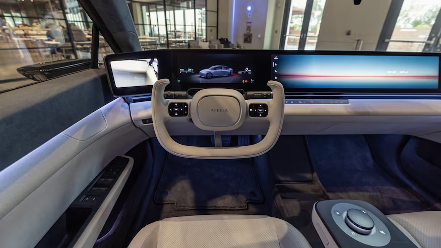 Afeela имеет ожидаемый цифровой дисплей водителя, а справа от него расположен сверхширокий экран, разделенный на центральную и пассажирскую зоны. На внешних краях приборной панели расположены небольшие экраны, которые заменяют зеркала бокового вида. Мы уже видели их на концепт-карах; SHM сообщила нам, что ожидает одобрения регуляторов на камеры к тому времени, когда Afeela поступит в продажу в 2026 году.