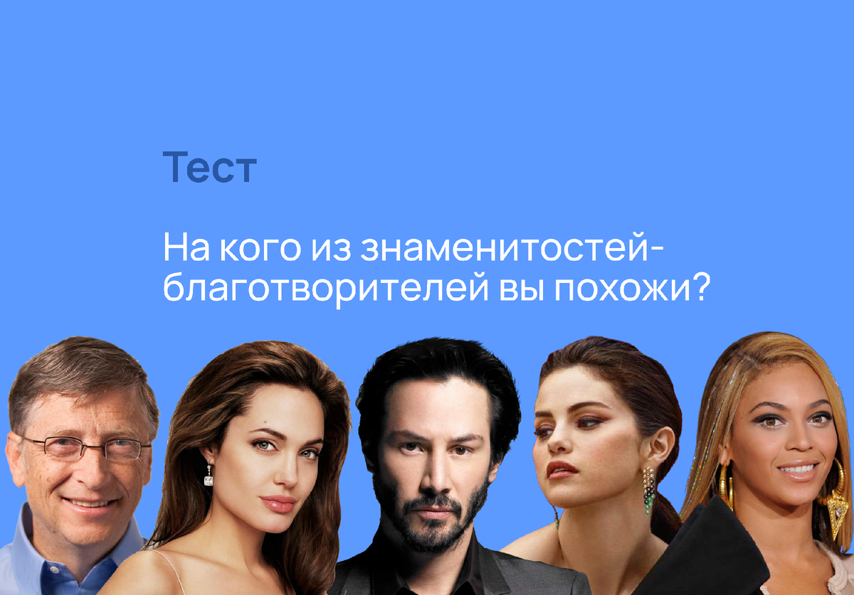 В жизни каждого человека настает момент, когда он задумывается о благотворительности. Но для того, чтобы начать свой путь в этой сфере, нам зачастую не хватает мотивации. В такие моменты просто необходим пример для подражания! К счастью, его легко можно найти среди знаменитостей и мировых звезд — многие из них активно участвуют в благотворительности и привлекают к добрым делам миллионы неравнодушных людей. Предлагаем вам пройти тест, чтобы определить, на какую звезду-благотворителя вы больше всего похожи. Может, конкретный пример из результата станет для вас путеводной звездой на пути к благотворительности? Делитесь своими результатами в комментариях!